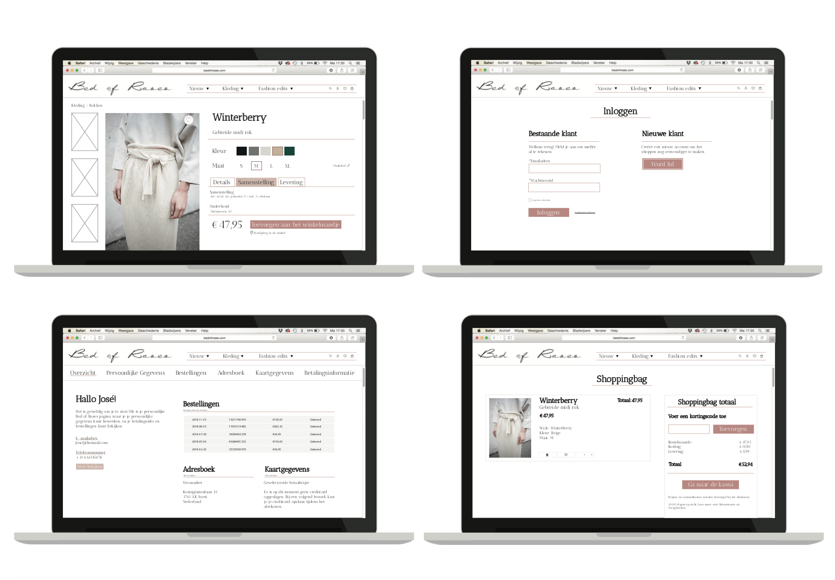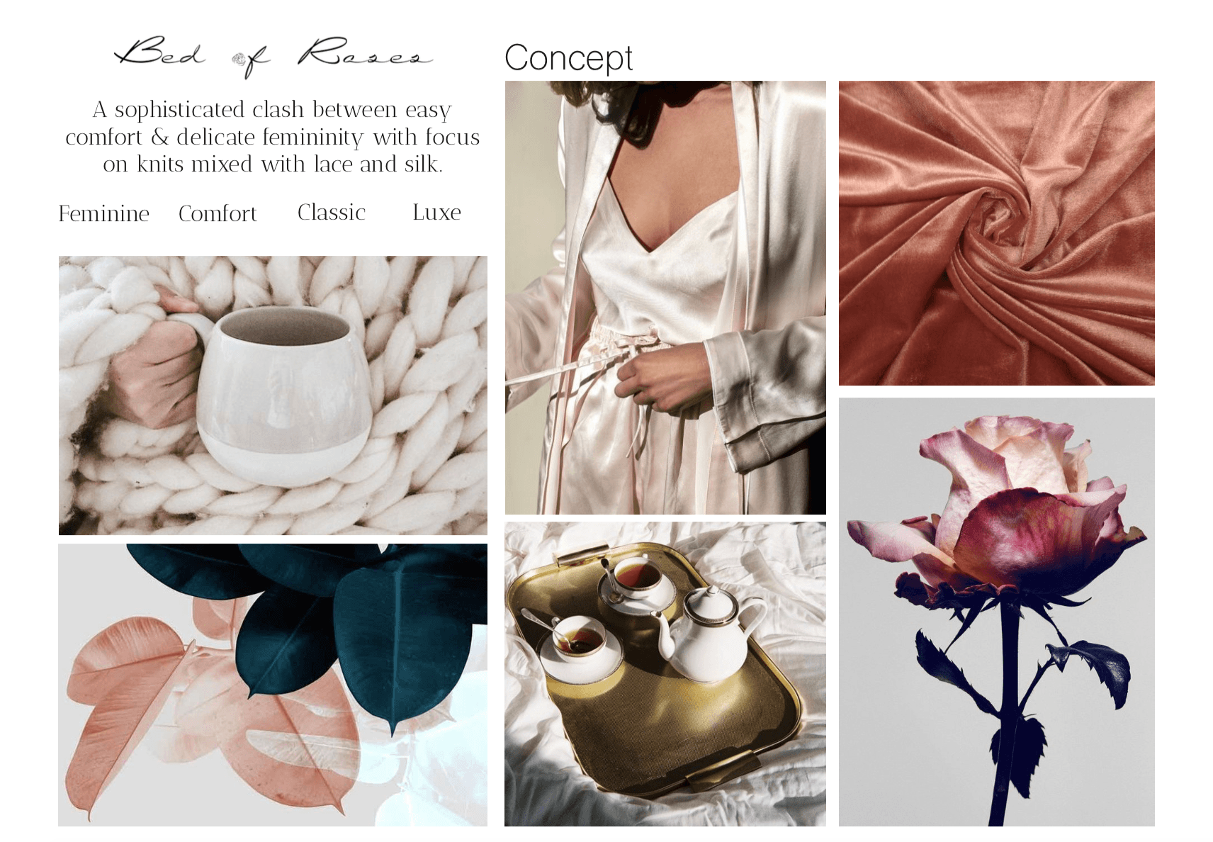 Bed of Roses is fictive clothing brand that clashes between easy comfort & delicate femininity. By performing target research, we (group assignment) came to the conclusion that there is a need in the Dutch market for sophisticated comfort wear with focus on knits mixed with lace and silk.