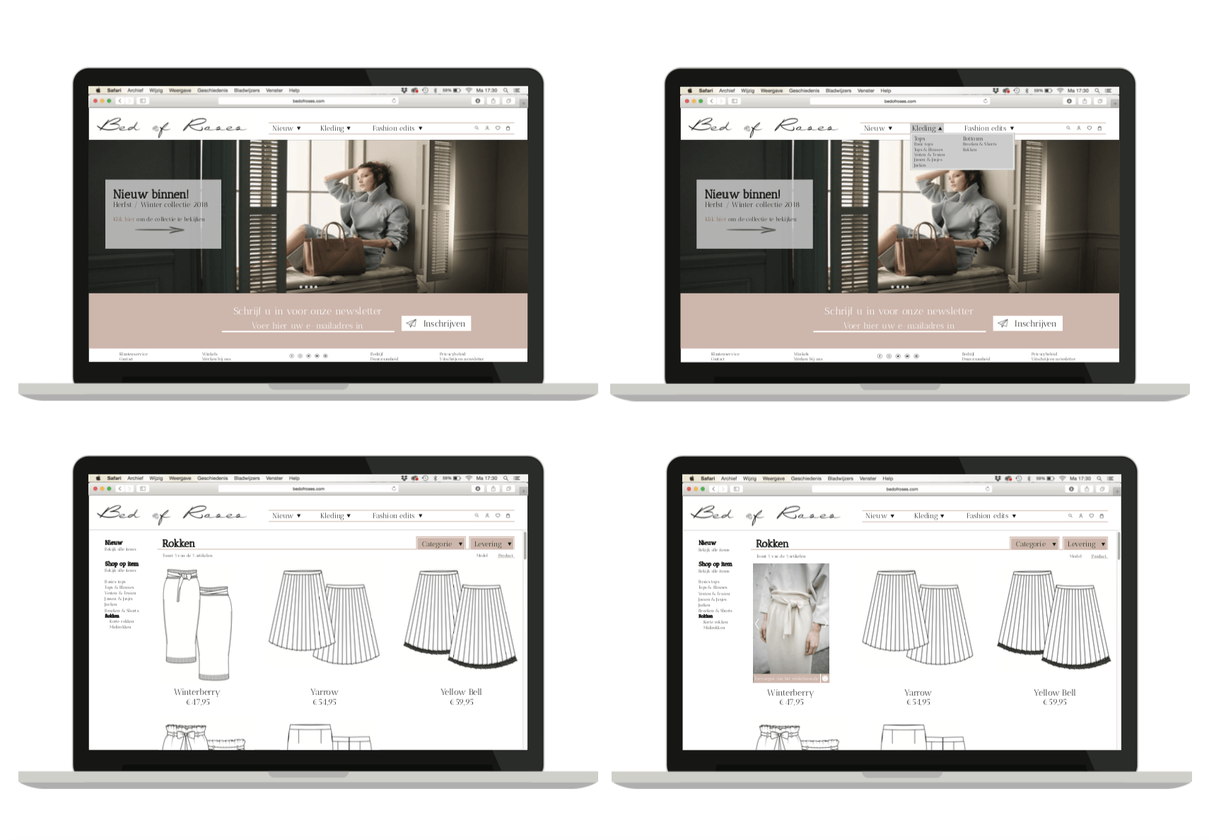The logo and website that I designed looks simple with female elements. The simple layout makes it easy for the consumer to move through the website to purchase items (thoughtful user experience). When designing the website we looked at the web shops of the competitors. My Adobe skills were tested when making the layouts for the dummy website.